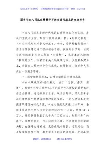 / 副市长在八项规定精神学习教育读书班上的交流发言