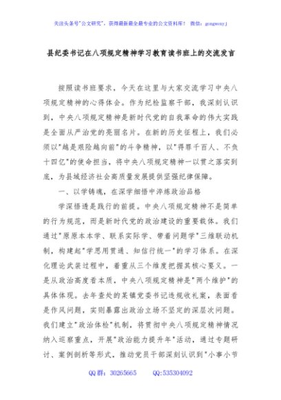 / 县纪委书记在八项规定精神学习教育读书班上的交流发言