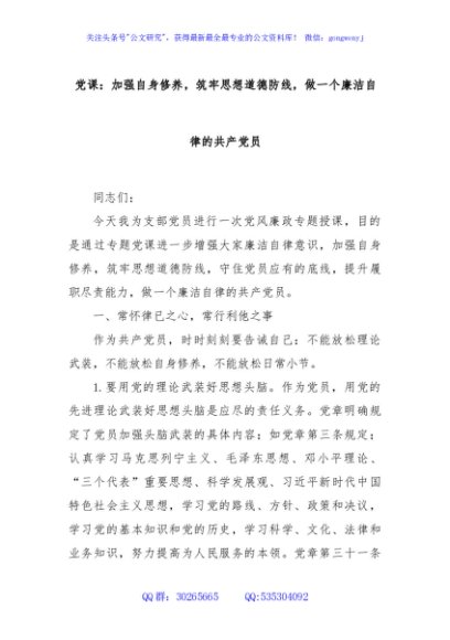 / 党课:加强自身修养,筑牢思想道德防线,做一个廉洁自律的共产党员