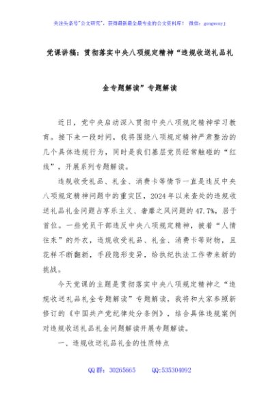 / 党课讲稿:贯彻落实中央八项规定精神“违规收送礼品礼金专题解读”专题解读