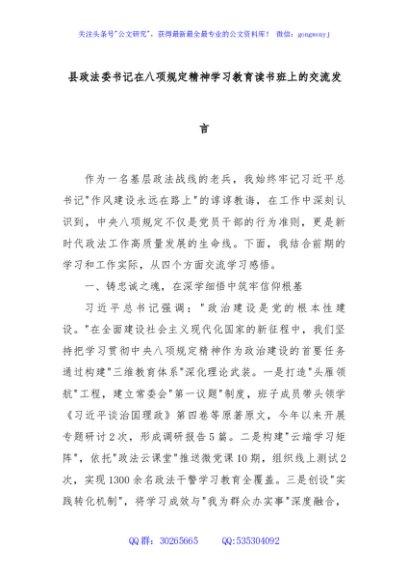 / 县政法委书记在八项规定精神学习教育读书班上的交流发言