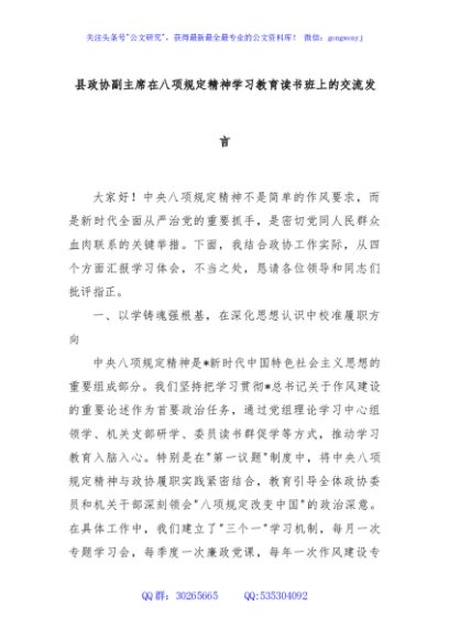 / 县政协副主席在八项规定精神学习教育读书班上的交流发言