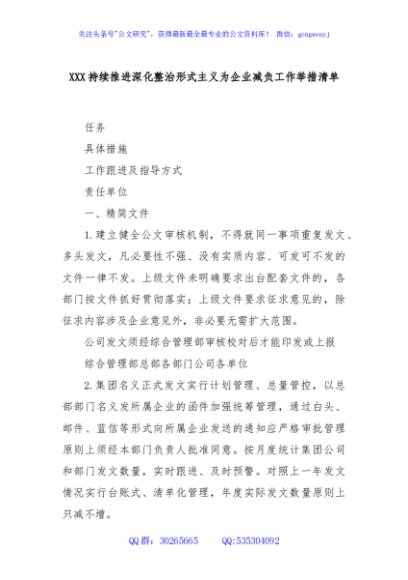 XXX持续推进深化整治形式主义为企业减负工作举措清单