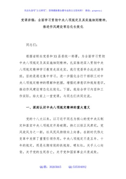 / 党课讲稿:全面学习贯彻中央八项规定及其实施细则精神,推进作风建设常态化长效化