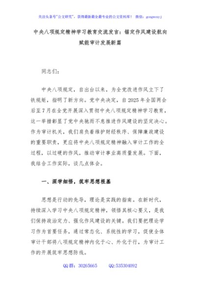 / 中央八项规定精神学习教育交流发言:锚定作风建设航向赋能审计发展新篇