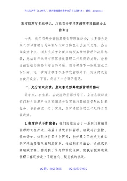 / 某省财政厅党组书记、厅长在全省预算绩效管理推进会上的讲话