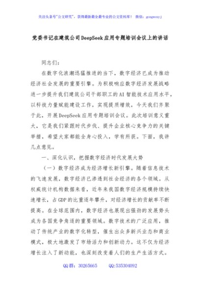 / 党委书记在建筑公司DeepSeek应用专题培训会议上的讲话