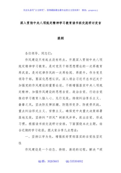/ 深入贯彻中央八项规定精神学习教育读书班交流研讨发言提纲