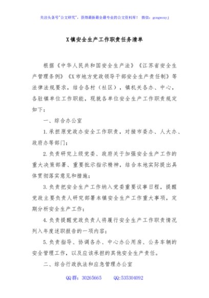 / X镇安全生产工作职责任务清单