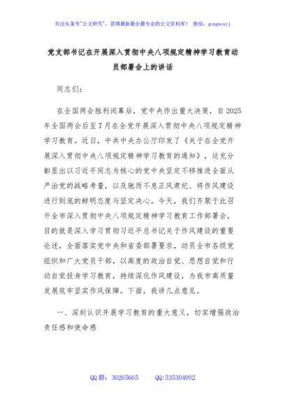/ 党支部书记在开展深入贯彻中央八项规定精神学习教育动员部署会上的讲话