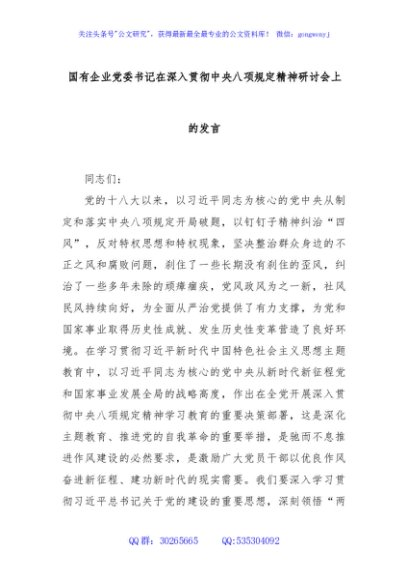 / 国有企业党委书记在深入贯彻中央八项规定精神研讨会上的发言