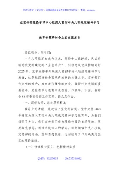 / 在宣传部理论学习中心组深入贯彻中央八项规定精神学习教育专题研讨会上的交流发言