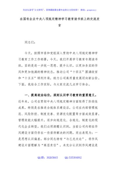 / 在国有企业中央八项规定精神学习教育读书班上的交流发言
