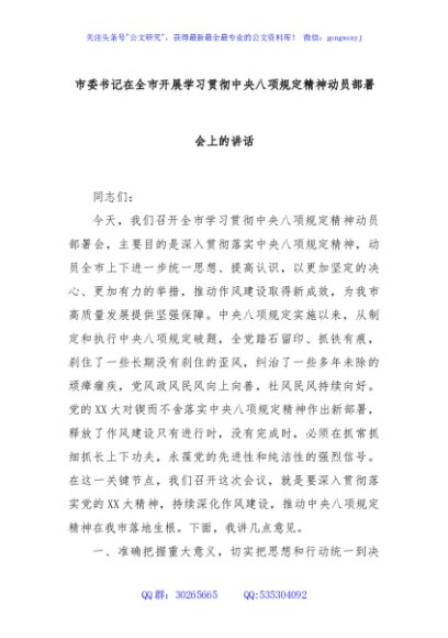 / 市委书记在全市开展学习贯彻中央八项规定精神动员部署会上的讲话