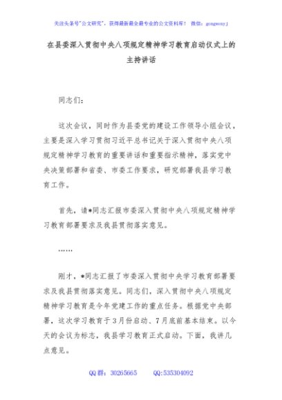 / 在县委深入贯彻中央八项规定精神学习教育启动仪式上的主持讲话