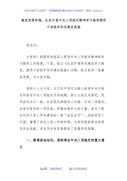 / 廉政党课讲稿:扎实开展中央八项规定精神学习教育锲而不舍筑牢作风建设根基