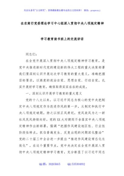 / 在农商行党委理论学习中心组深入贯彻中央八项规定精神学习教育读书班上的交流讲话