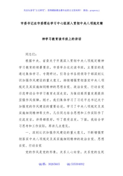 / 市委书记在市委理论学习中心组深入贯彻中央八项规定精神学习教育读书班上的讲话