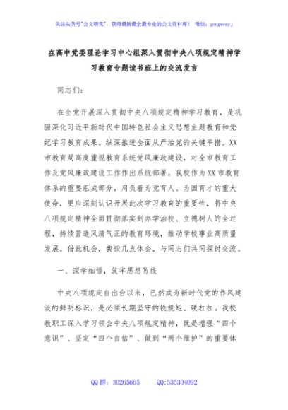 / 在高中党委理论学习中心组深入贯彻中央八项规定精神学习教育专题读书班上的交流发言
