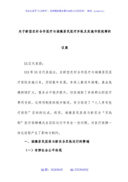 / 关于新型农村合作医疗与城镇居民医疗并轨及实施市级统筹的议案