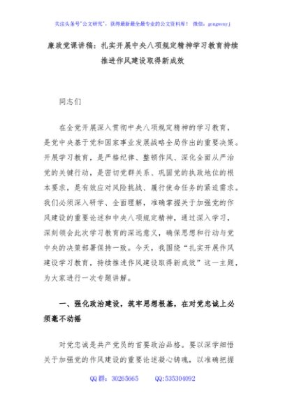 廉政党课讲稿:扎实开展中央八项规定精神学习教育持续推进作风建设取得新成效