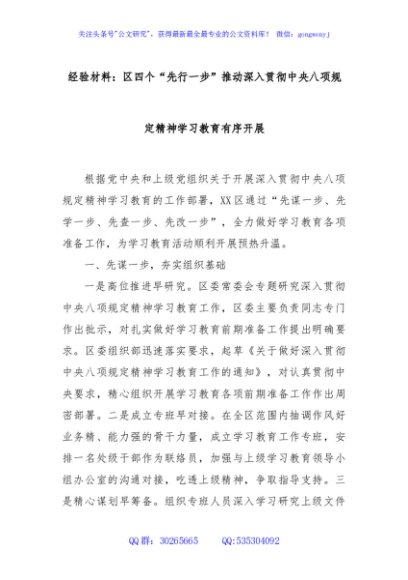 / 经验材料:区四个“先行一步”推动深入贯彻中央八项规定精神学习教育有序开展