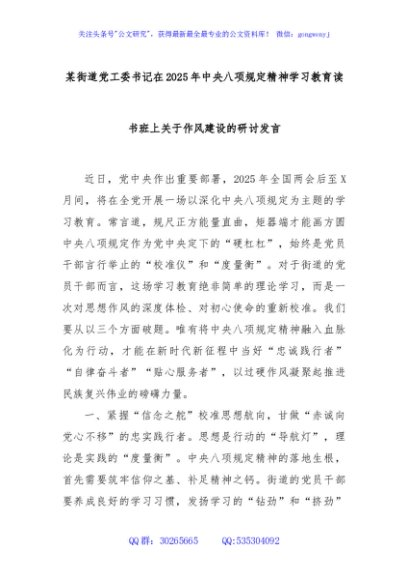 / 某街道党工委书记在2025年中央八项规定精神学习教育读书班上关于作风建设的研讨发言