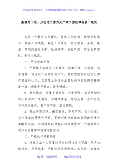 / 某镇关于进一步改进工作作风严肃工作纪律的若干规定