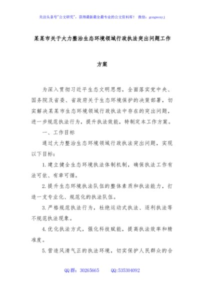 / 某某市关于大力整治生态环境领域行政执法突出问题工作方案