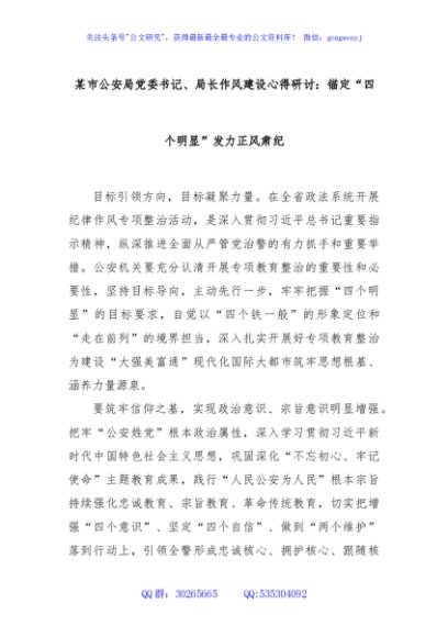 / 某市公安局党委书记、局长作风建设心得研讨:锚定“四个明显”发力正风肃纪