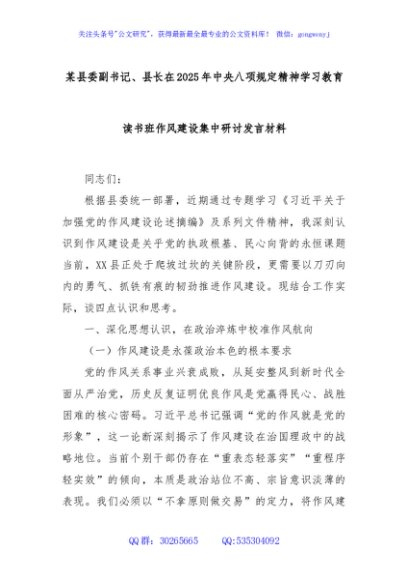 / 某县委副书记、县长在2025年中央八项规定精神学习教育读书班作风建设集中研讨发言材料