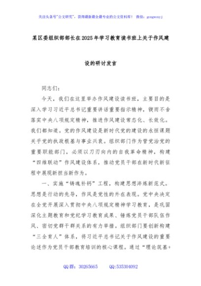 / 某区委组织部部长在2025年学习教育读书班上关于作风建设的研讨发言