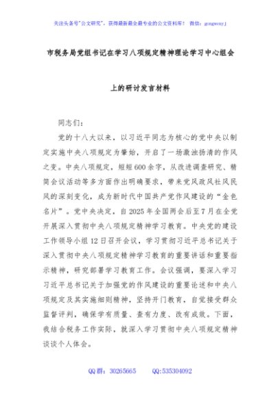 / 市税务局党组书记在学习八项规定精神理论学习中心组会上的研讨发言材料