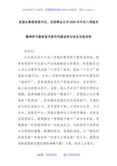/ 某国企集团党委书记、总经理在公司2025年中央八项规定精神学习教育读书班作风建设研讨发言交流材料