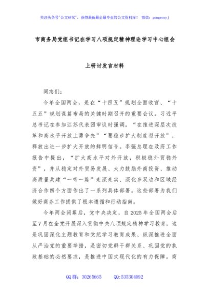 / 市商务局党组书记在学习八项规定精神理论学习中心组会上研讨发言材料