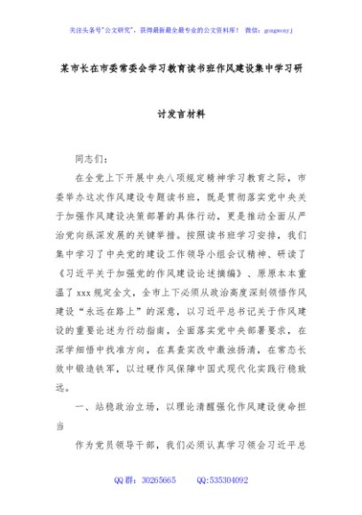 / 某市长在市委常委会学习教育读书班作风建设集中学习研讨发言材料