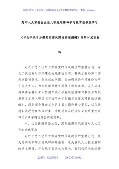 / 某市人大常委会主任八项规定精神学习教育读书班学习《总书记关于加强党的作风建设论述摘编》的研讨发言材料