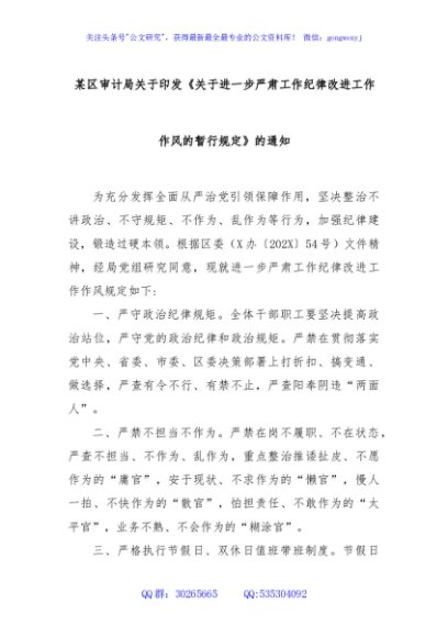 / 某区审计局关于印发《关于进一步严肃工作纪律改进工作作风的暂行规定》的通知