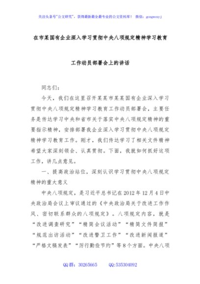 / 在市某国有企业深入学习贯彻中央八项规定精神学习教育工作动员部署会上的讲话