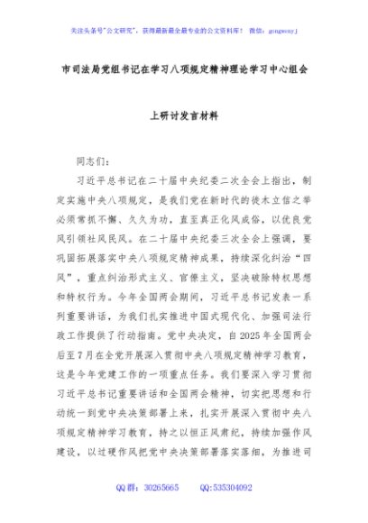 / 市司法局党组书记在学习八项规定精神理论学习中心组会上研讨发言材料