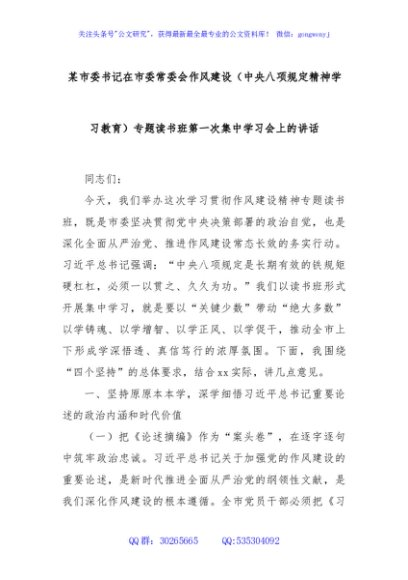 / 某市委书记在市委常委会作风建设(中央八项规定精神学习教育)专题读书班第一次集中学习会上的讲话