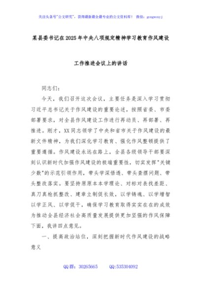 / 某县委书记在2025年中央八项规定精神学习教育作风建设工作推进会议上的讲话