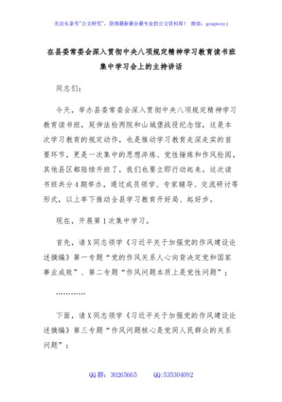 / 在县委常委会深入贯彻中央八项规定精神学习教育读书班集中学习会上的主持讲话