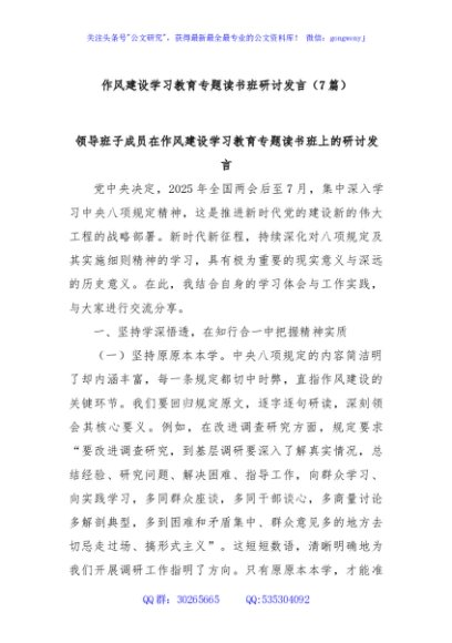 / (7篇)作风建设学习教育专题读书班研讨发言