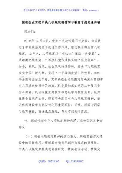 / 国有企业贯彻中央八项规定精神学习教育专题党课讲稿