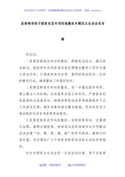 / 县委领导班子脱贫攻坚专项巡视整改专题民主生活会发言稿
