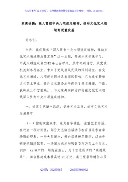 / 党课讲稿:深入贯彻中央八项规定精神,推动文化艺术领域高质量发展