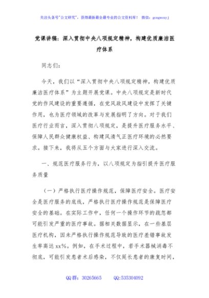 / 党课讲稿:深入贯彻中央八项规定精神,构建优质廉洁医疗体系