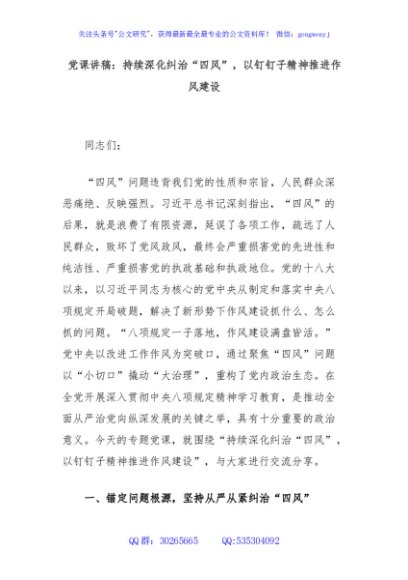 / 党课讲稿:持续深化纠治“四风”,以钉钉子精神推进作风建设