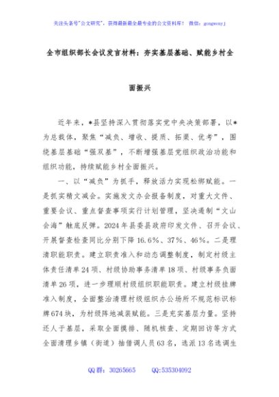 / 全市组织部长会议发言材料:夯实基层基础、赋能乡村全面振兴
